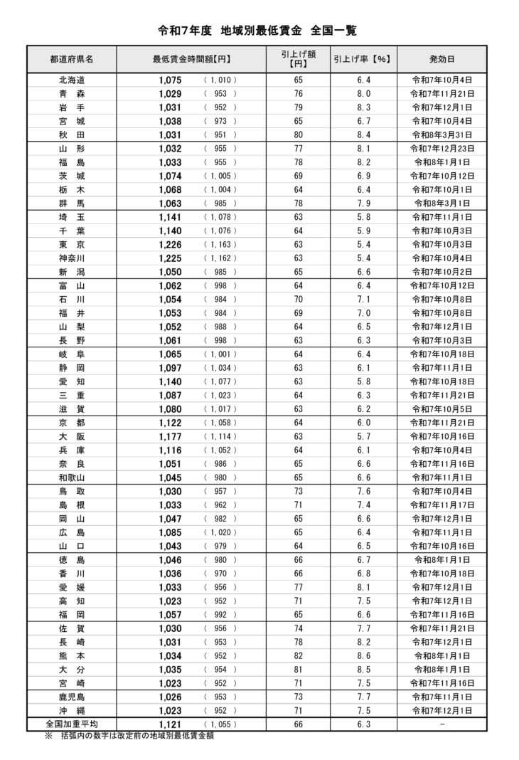 発効日は地域によって異なりますが、令和7年10月1日より順次最低賃金の引き上げが行われます。