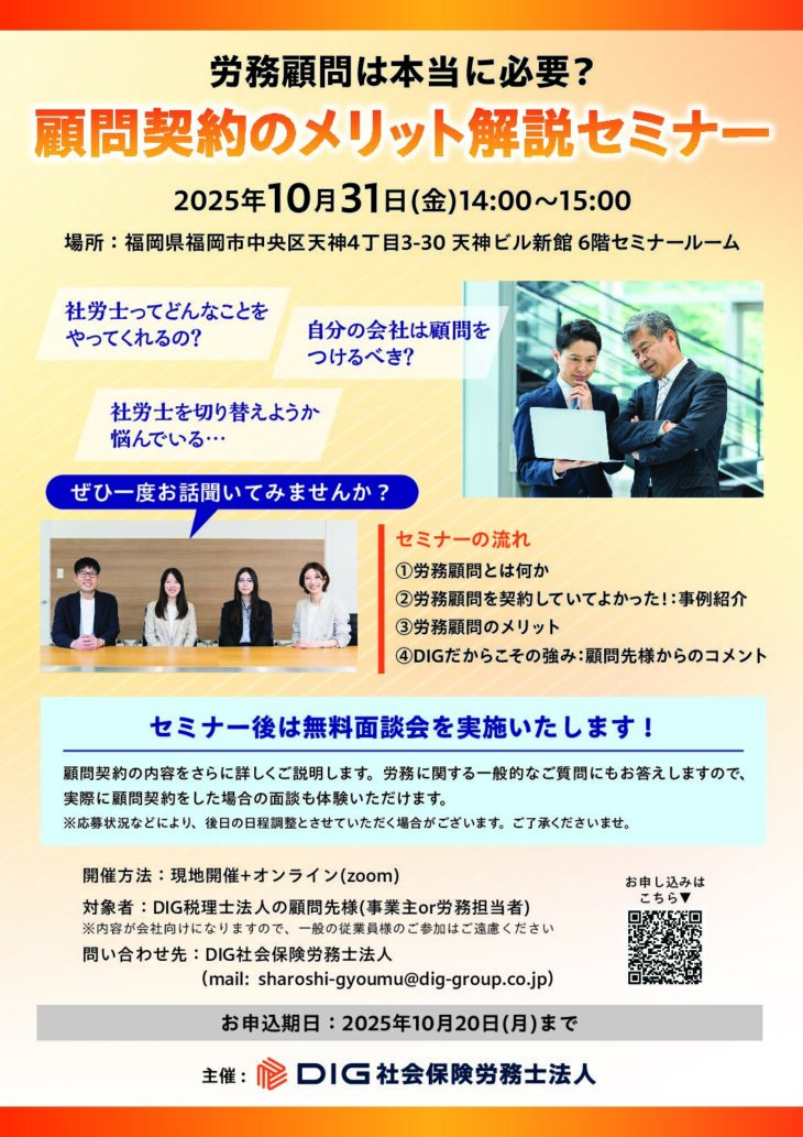 顧問契約の内容の深堀や、労務に関する一般的なご質問にもお答えできますので、是非ご参加ください。