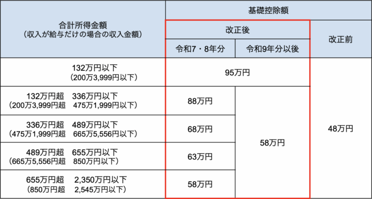 これまで一律48万円だった基礎控除が、所得金額に応じて段階的に見直され、最大95万円まで引き上げられました。