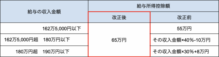 給与収入が190万円以下の方については、給与所得控除が一律65万円に引き上げられました。