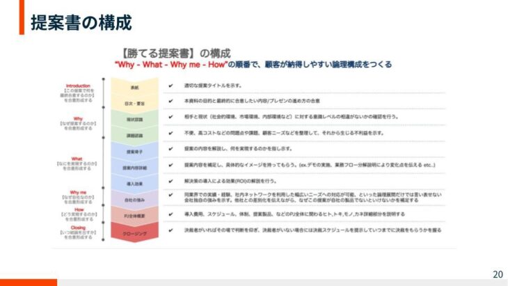 Why(背景・目的)→ What(課題・提案内容)→ Why me(なぜ私たちなのか)→ How(実行計画)
