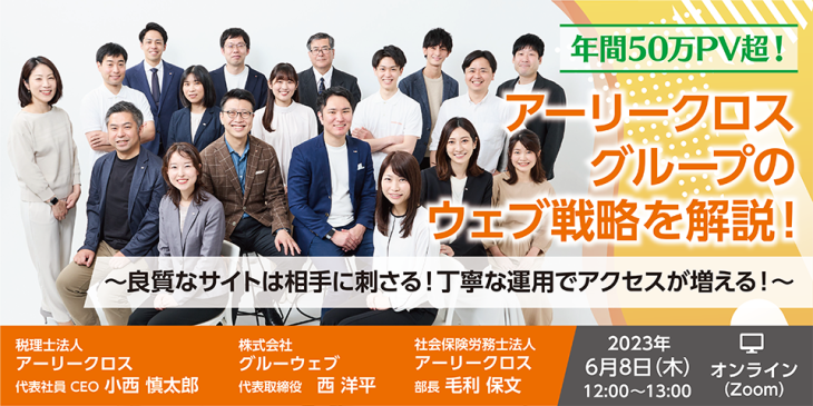 2023.05.09 年間50万PV超!アーリークロスグループのウェブ戦略を解説 ~良質なサイトは相手に刺さる!丁寧な運用でアクセスが増える!~成果につながるホームページ制作やウェブマーケティングについてアーリークロスグループの実例を通してお伝えします! 2018年の法人設立から5年間で顧問先500社様以上、従業員数100名以上へと成長したアーリークロスグループ […]