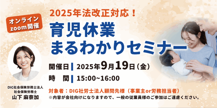 2025.08.18 2025年法改正対応!育児休業まるわかりセミナー育児休業取得時に会社が行うべき対応についてご存知ですか? 「入社してすぐでも育休はとらせなきゃいけないの?」「育休中にもらえる手当は?」「育児を理由に退職されるのは困る」 そんな疑問にお答えします! このような方へおすす […]