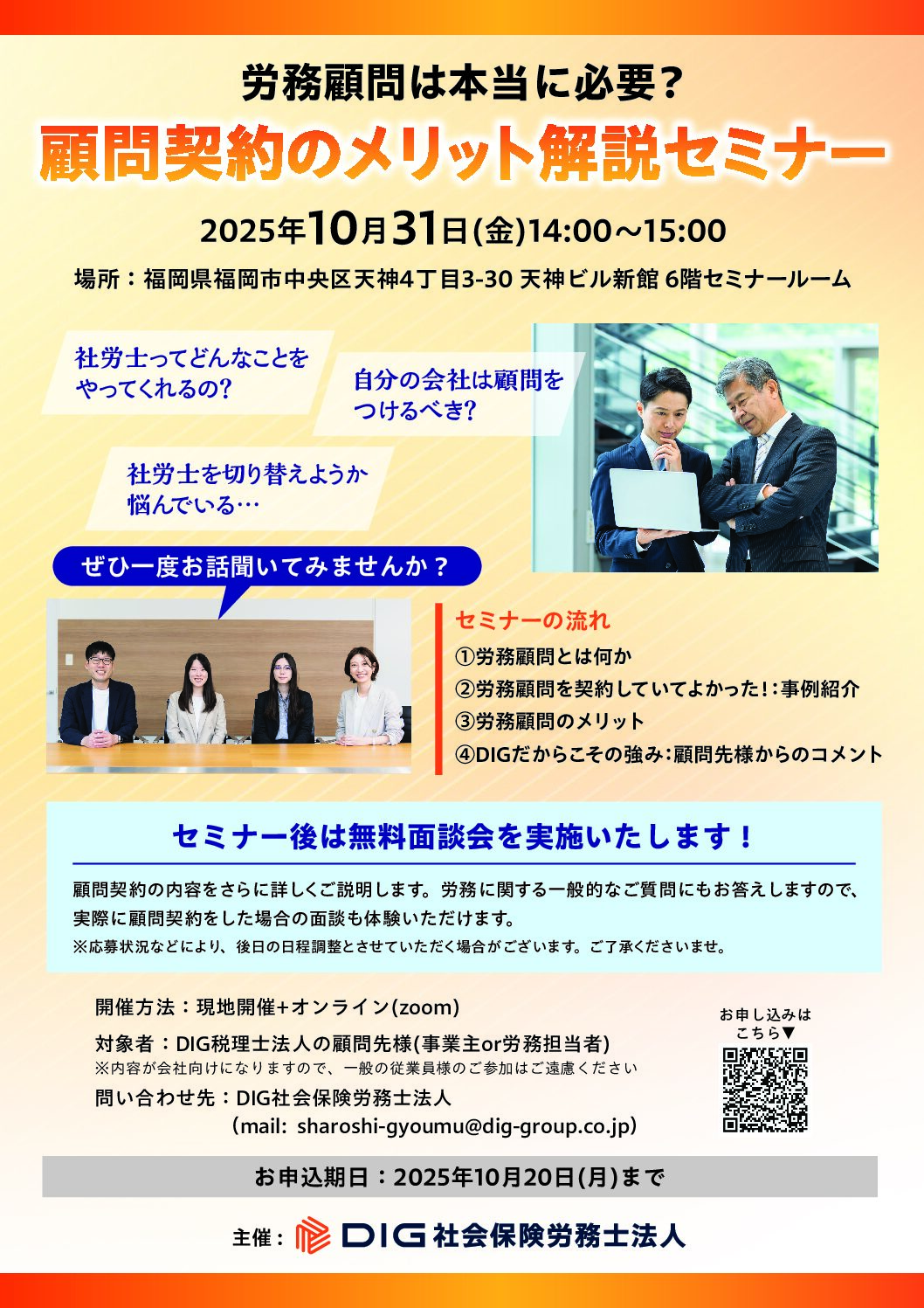 2025.10.10 セミナー開催のお知らせ『労務顧問の必要性・メリット』こんにちは!福岡市にありますDIG社会保険労務士法人(旧:社会保険労務士法人アーリークロス)です。今回は、セミナー開催のお知らせです。 セミナー概要 テーマ:「労務顧問は本当に必要?顧問契約のメリットとは」日時: 10月 […]